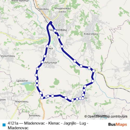 The first stop of the 4121a bus route is Mladenovac As and the last stop is Mladenovac As. 4121a (Mladenovac - Klenac - Jagnjilo - Lug - Mladenovac) is operational during on weekdays.