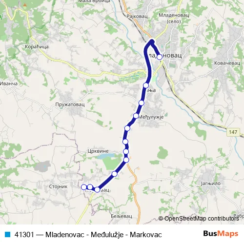 Click here to view the nearest 41301 - Mladenovac - Međulužje - Markovac bus stop.