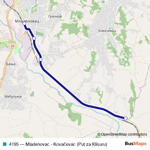 Click here to view the nearest 4195 - Mladenovac - Kovačevac (Put za Klisuru) bus stop.