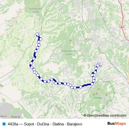The first stop of the 4428a bus route is Sopot As and the last stop is Barajevo As. 4428a (Sopot - Dučina - Slatina - Barajevo) is operational during everyday.