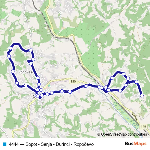 Click here to view the nearest 4444 - Sopot - Senja - Đurinci - Ropočevo bus stop.