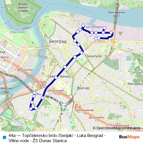 The first stop of the 44a bus route is Železnička stanica Dunav and the last stop is Topčidersko brdo /Senjak/. 44a (Topčideresko brdo /Senjak/ - Luka Beograd - Viline vode - ŽS Dunav Stanica) is operational during everyday.
