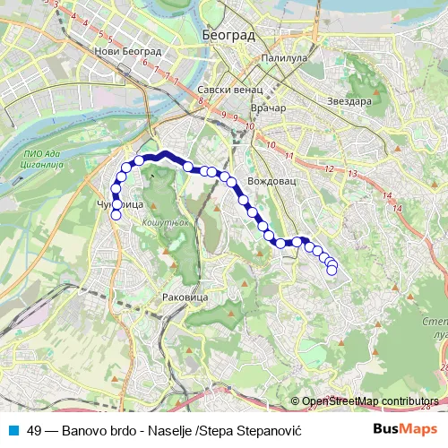 The first stop of the 49 bus route is Banovo brdo and the last stop is Naselje Stepa Stepanović. 49 (Banovo brdo - Naselje /Stepa Stepanović) is operational during everyday.