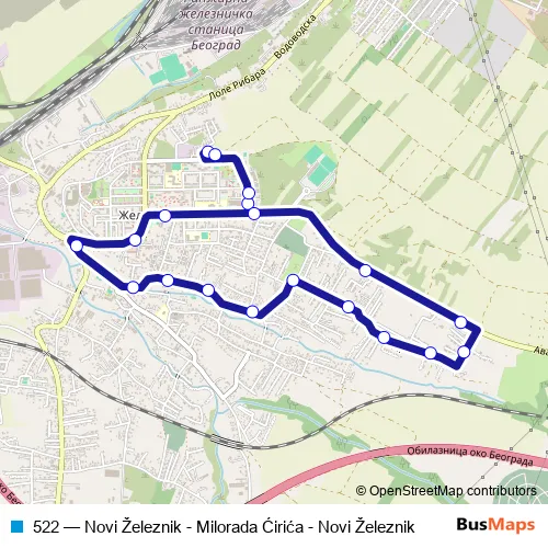 The first stop of the 522 bus route is Novi Železnik and the last stop is Novi Železnik. 522 (Novi Železnik - Milorada Ćirića - Novi Železnik) is operational during everyday.