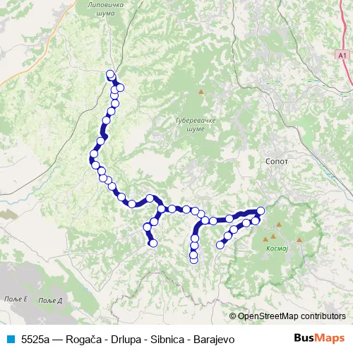 The first stop of the 5525a bus route is Rogača - Okretnica and the last stop is Barajevo As. 5525a (Rogača - Drlupa - Sibnica - Barajevo) is operational during on weekdays.