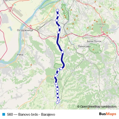 The first stop of the 560 bus route is Banovo brdo and the last stop is Barajevo As. 560 (Banovo brdo - Barajevo) is operational during everyday.