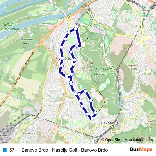 The first stop of the 57 bus route is Banovo brdo and the last stop is Banovo brdo. 57 (Banovo Brdo - Naselje Golf - Banovo Brdo) is operational during everyday.
