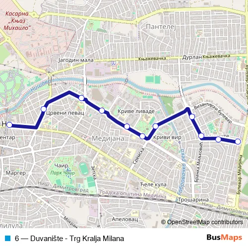 The first stop of the 6 bus route is Duvanište ( ka centru) and the last stop is Trg kralja Milana (ka Uredu). 6 (Duvanište - Trg Kralja Milana) is operational during everyday.