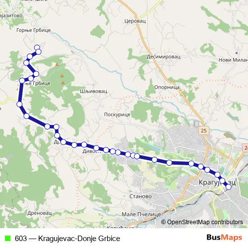 The first stop of the 603 bus route is Donje Grbice Prodavnica and the last stop is Autobuska Stanica I. 603 (Kragujevac-Donje Grbice) is operational during everyday.
