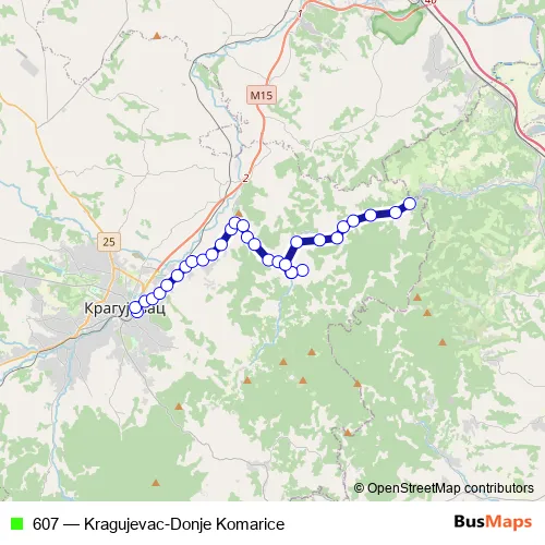 The first stop of the 607 bus route is Autobuska Stanica I and the last stop is Donje Komarice. 607 (Kragujevac-Donje Komarice) is operational during everyday.