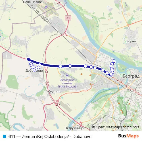 The first stop of the 611 bus route is Kej oslobođenja and the last stop is Dobanovci /groblje. 611 (Zemun /Kej Oslobođenja/ - Dobanovci) is operational during everyday.