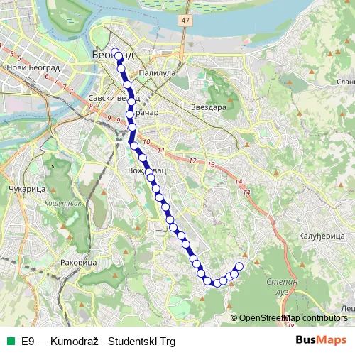 The first stop of the E9 bus route is Studentski trg and the last stop is Kumodraž. E9 (Kumodraž - Studentski Trg) is operational during on weekdays.