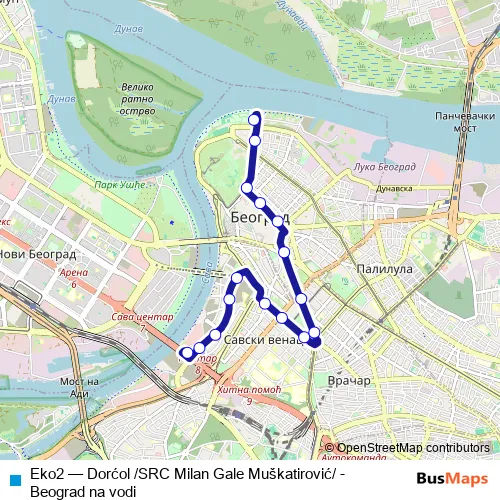 The first stop of the Eko2 bus route is Beograd na vodi and the last stop is Dorćol /SRC Milan Gale Muškatirović/. Eko2 (Dorćol /SRC Milan Gale Muškatirović/ - Beograd na vodi) is operational during everyday.