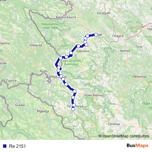 The first stop of the Re 2151 rail route is Užice and the last stop is Prijepolje teretna. Re 2151 is operational during everyday.