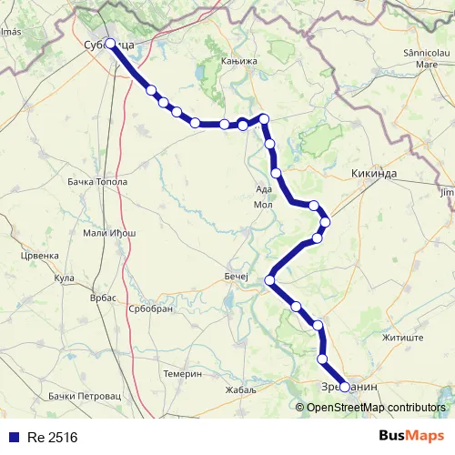 The first stop of the Re 2516 rail route is Zrenjanin and the last stop is Subotica. Re 2516 is operational during on weekdays.
