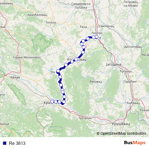 The first stop of the Re 3813 rail route is Lapovo and the last stop is Kraljevo. Re 3813 is operational during on weekdays.