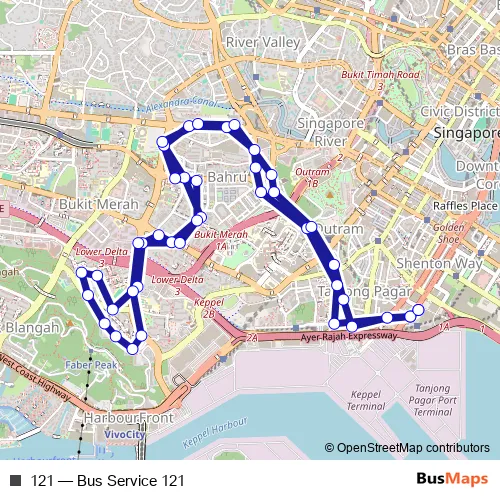 The first stop of the 121 bus route is Shenton Way Ter and the last stop is Shenton Way Ter. 121 (Bus Service 121) is operational during everyday.