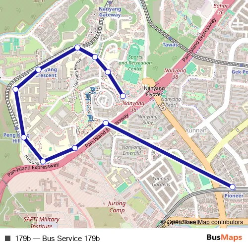 The first stop of the 179b bus route is Hall 1 and the last stop is Pioneer Stn Exit B. 179b (Bus Service 179b) is operational during everyday.