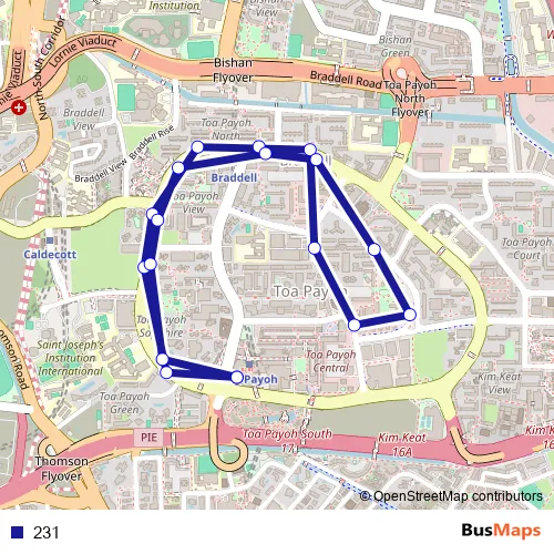 The first stop of the 231 bus route is Toa Payoh Int and the last stop is Toa Payoh Int. 231 is operational during everyday.