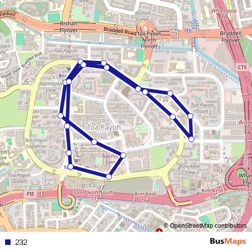 The first stop of the 232 bus route is Toa Payoh Int and the last stop is Toa Payoh Int. 232 is operational during everyday.
