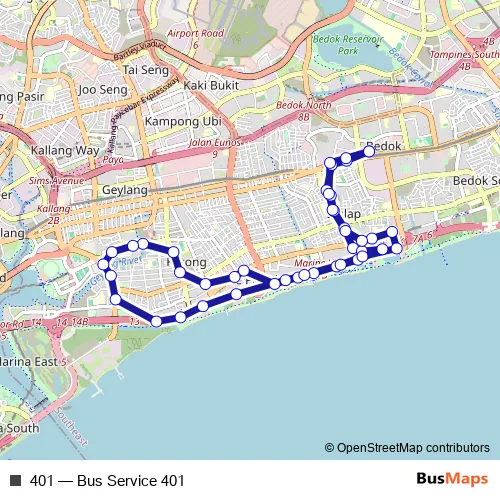The first stop of the 401 bus route is Bedok Int and the last stop is Bedok Int. 401 (Bus Service 401) is operational during everyday.