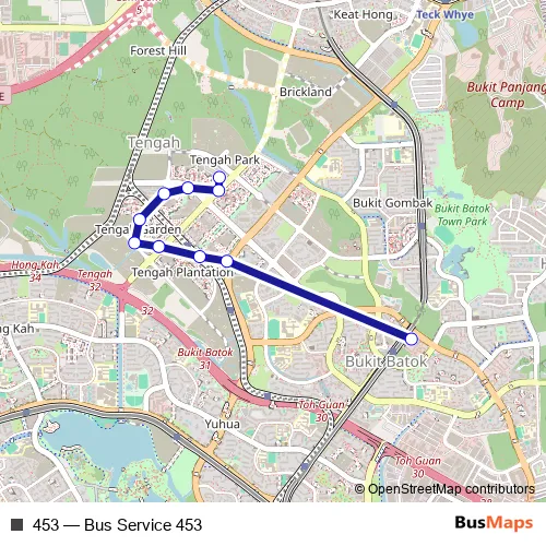 The first stop of the 453 bus route is Tengah Int and the last stop is Bt Batok Int. 453 (Bus Service 453) is operational during everyday.
