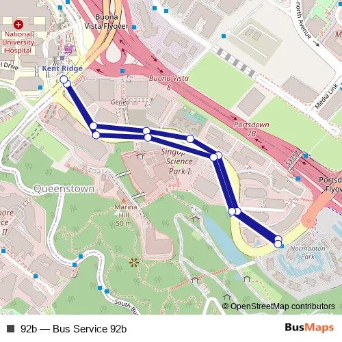 The first stop of the 92b bus route is Kent Ridge Stn Exit B and the last stop is Kent Ridge Stn. 92b (Bus Service 92b) is operational during everyday.