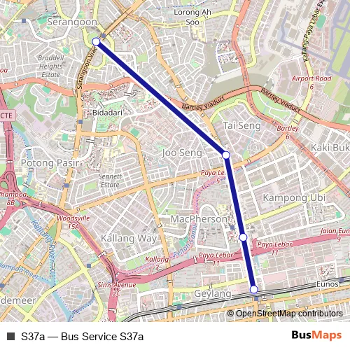 The first stop of the S37a bus route is S'Goon Stn Exit B and the last stop is Paya Lebar Stn Exit B. S37a (Bus Service S37a) is operational during everyday.