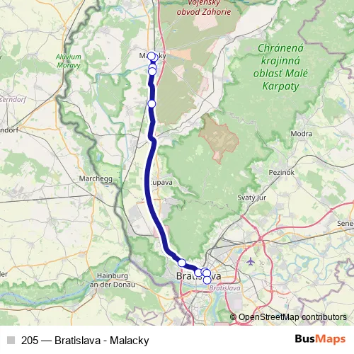 The first stop of the 205 bus route is Malacky, Žel. stanica and the last stop is Bratislava, Autobusová stanica. 205 (Bratislava - Malacky) is operational during on weekdays.