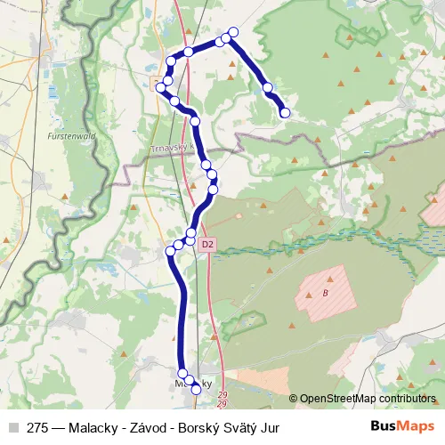 The first stop of the 275 bus route is Malacky, Žel. stanica and the last stop is Borský Svätý Jur, Tomky. 275 (Malacky - Závod - Borský Svätý Jur) is operational during everyday.