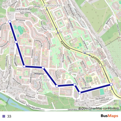 The first stop of the 33 trolleybus route is Riviéra and the last stop is Dlhé diely. 33 is operational during everyday.