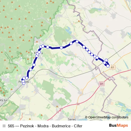 The first stop of the 565 bus route is Pezinok, Žel. stanica and the last stop is Cífer, Žel. stanica. 565 (Pezinok - Modra - Budmerice - Cífer) is operational during everyday.