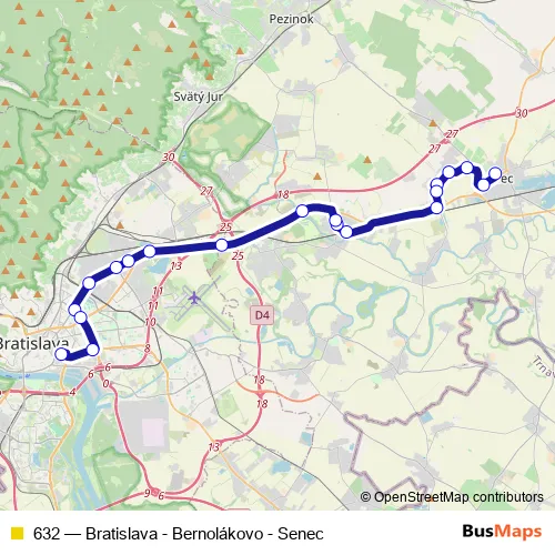 The first stop of the 632 bus route is Senec, Aut. stanica and the last stop is Bratislava, As. 632 (Bratislava - Bernolákovo - Senec) is operational during everyday.