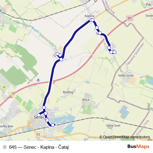 The first stop of the 645 bus route is Senec, Aut. stanica and the last stop is Čataj, Obratisko. 645 (Senec - Kaplna - Čataj) is operational during everyday.