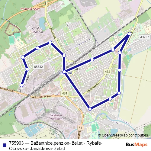The first stop of the 755903 bus route is Hodonín,žel.st. and the last stop is Hodonín,Bažantnice penzion. 755903 (Bažantnice,penzion- žel.st.- Rybáře- Očovská- Janáčkova- žel.st) is operational during on weekdays.