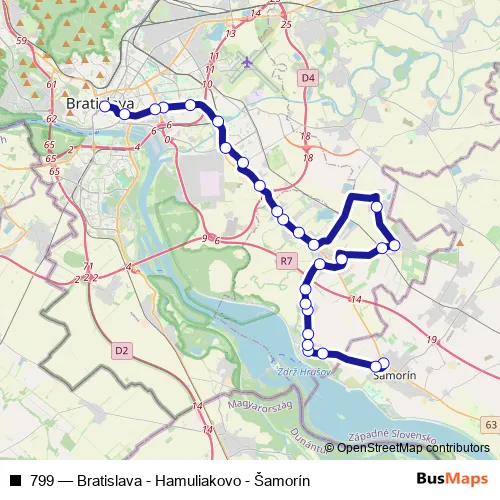 The first stop of the 799 bus route is Šamorín, Aut. stanica and the last stop is Bratislava, Kollárovo nám.. 799 (Bratislava - Hamuliakovo - Šamorín) is operational during everyday.