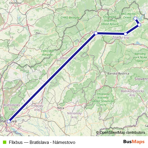 The first stop of the Flixbus bus route is Bratislava and the last stop is Námestovo, Námestovo,As. Flixbus (Bratislava - Námestovo) is operational during everyday.
