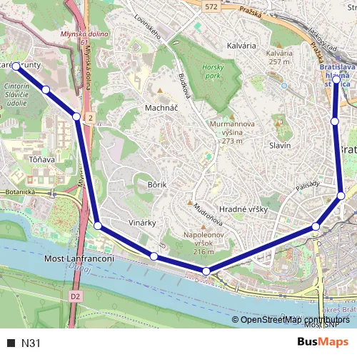 See why over 2 million users trust and consider busmaps.com as the best public transport website. busmaps gives you Bratislava Buses suggested routes, real-time bus tracker, line route maps in Bratislava, and helps to find the closest N31 bus stops near you. No internet available? Download an offline PDF map and bus schedule for the N31 bus to take on your trip.