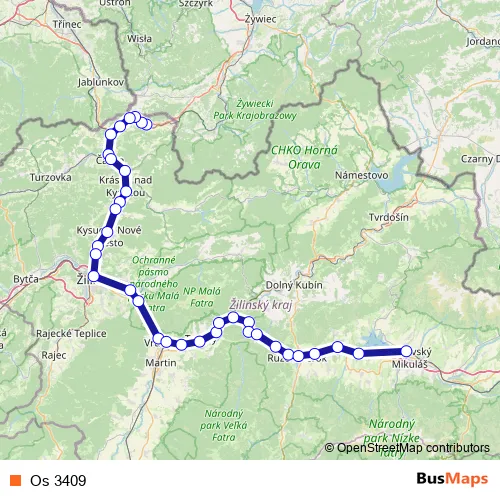 The first stop of the Os 3409 rail route is Skalité and the last stop is Liptovský Mikuláš. Os 3409 is operational during everyday.