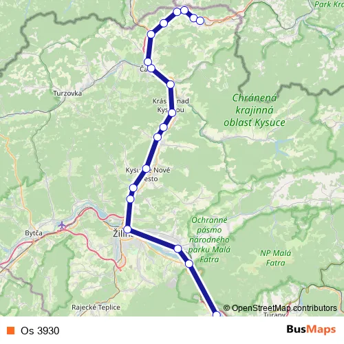 The first stop of the Os 3930 rail route is Vrútky and the last stop is Skalité. Os 3930 is operational during on weekdays.