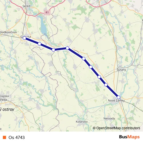 The first stop of the Os 4743 rail route is Galanta and the last stop is Nové Zámky. Os 4743 is operational during on weekdays.