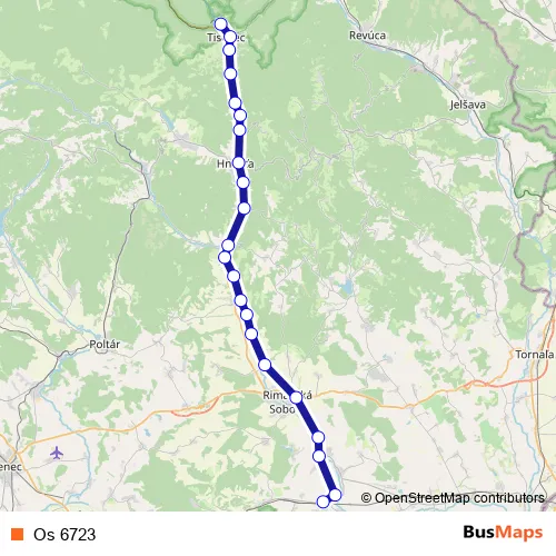 The first stop of the Os 6723 rail route is Tisovec and the last stop is Jesenské. Os 6723 is operational during everyday.