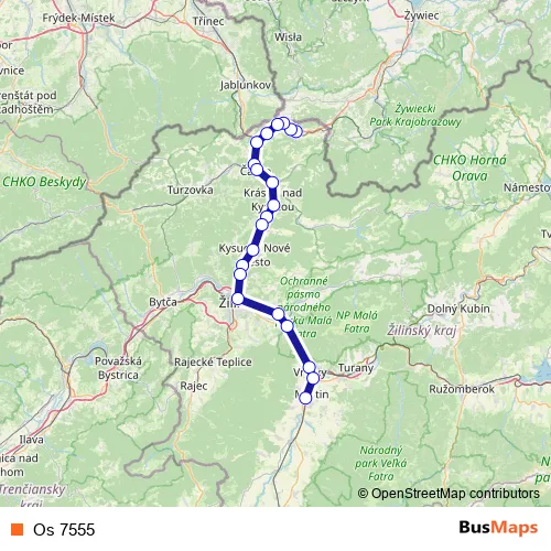The first stop of the Os 7555 rail route is Skalité and the last stop is Martin. Os 7555 is operational during everyday.