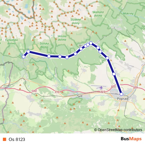 The first stop of the Os 8123 rail route is Štrbské Pleso and the last stop is Poprad-Tatry. Os 8123 is operational during everyday.