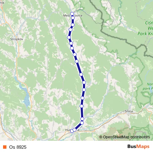 The first stop of the Os 8925 rail route is Humenné and the last stop is Medzilaborce mesto. Os 8925 is operational during everyday.