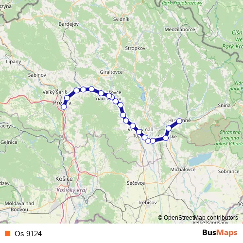 The first stop of the Os 9124 rail route is Humenné and the last stop is