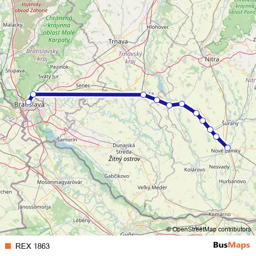 The first stop of the REX 1863 rail route is Bratislava hl.st. and the last stop is Nové Zámky. REX 1863 is operational during on weekdays.