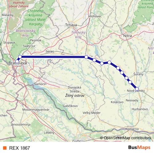 The first stop of the REX 1867 rail route is Bratislava hl.st. and the last stop is Nové Zámky. REX 1867 is operational during on weekdays.