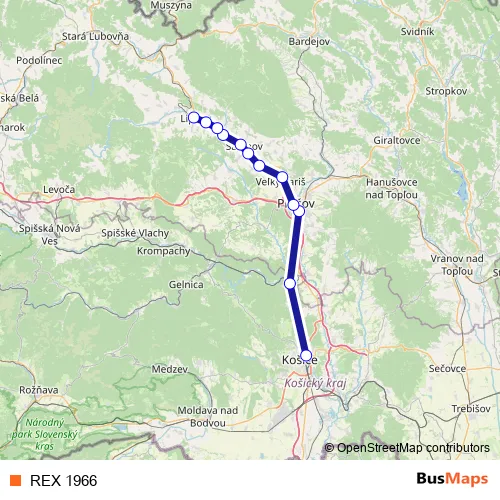 The first stop of the REX 1966 rail route is Košice and the last stop is Lipany. REX 1966 is operational during everyday.