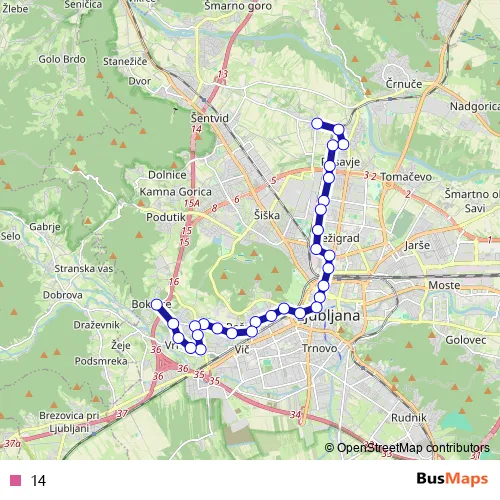 See why over 2 million users trust and consider busmaps.com as the best public transport website. busmaps gives you Ljubljana Buses suggested routes, real-time bus tracker, line route maps in Ljubljana, and helps to find the closest 14 bus stops near you. No internet available? Download an offline PDF map and bus schedule for the 14 bus to take on your trip.